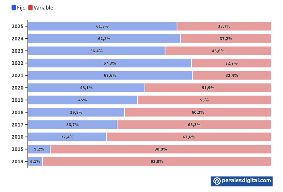 Mientras que hace una década las hipotecas variables dominaban con claridad, en 2025 más del 60% de los préstamos hipotecarios que se firman para comprar vivienda son a tipo fijo y apenas un 38–39% son de tipo variable, según los datos que acaba de publicar el Instituto Nacional de Estadística (INE) y que se refieren al mes de octubre.